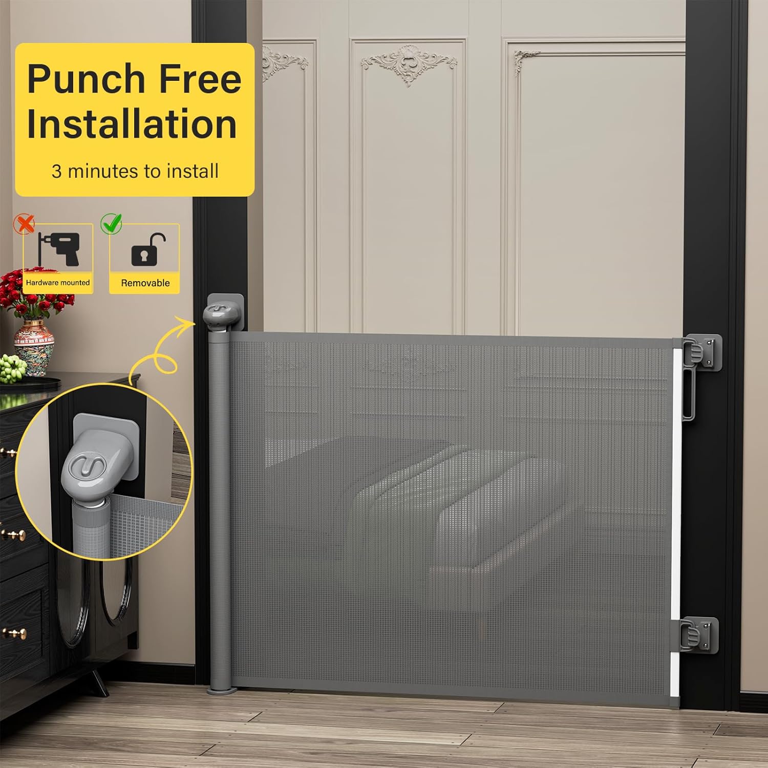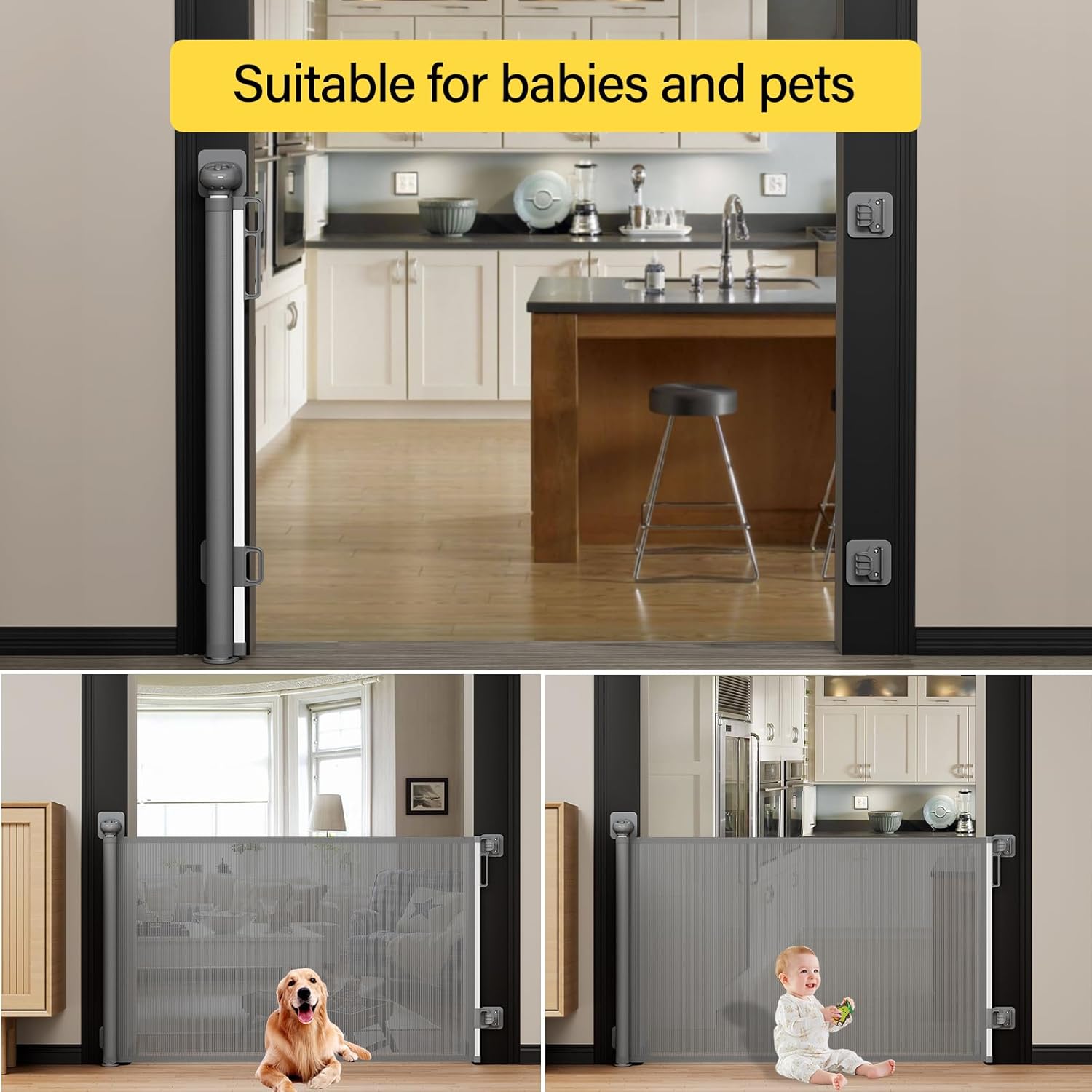 Babepai Baby Gate for Stairs No Drill, Punch Free Retractable Baby Gates Extends to 54″ Wide 34″ Tall, Reractable Dog Gate for Doorways, Stair Gate for Outdoor, Indoor, Hallways, Deck, Porch