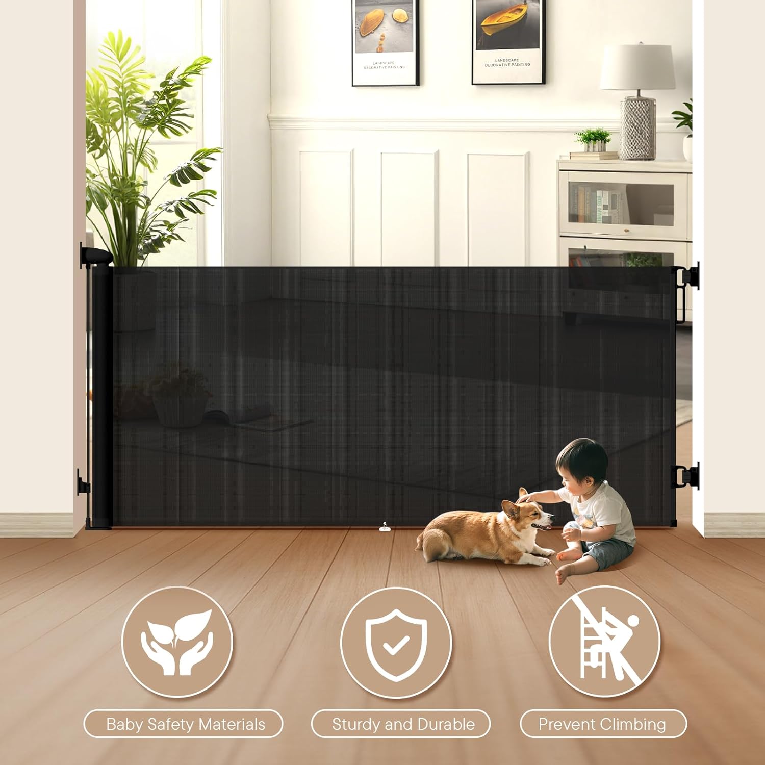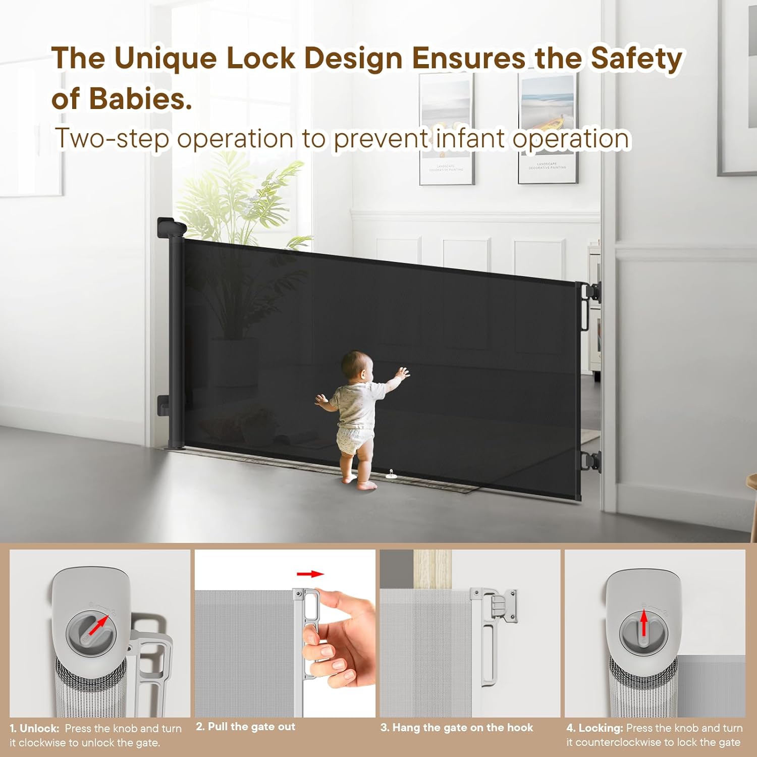 BBsecure Retractable Baby Gate – 55″ Wide Mesh Pet Gate with Anti-Crawling Hook, Safety Lock, One-Hand Operation, 34″ Tall Baby Gate for Stairs, Doorways, Hallways, Garage, Indoor Outdoor, Black