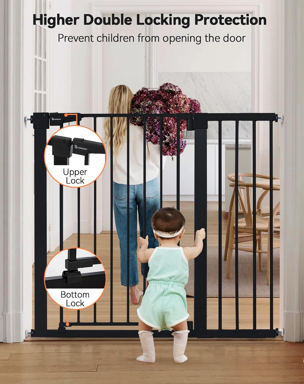 COMOMY 36″ Extra Tall Baby Gate for Stairs Doorways, Fits Openings 29.5″ to 43.3″ Wide, Auto Close Sturdy Safety Dog Gate for House, Pressure Mounted Easy Walk Through Pet Gate with Door, Black