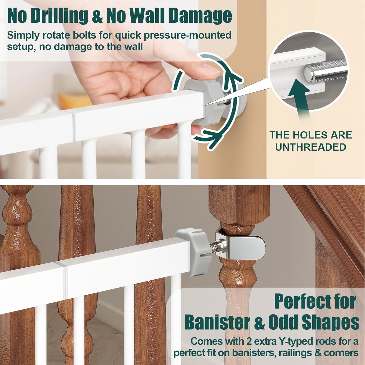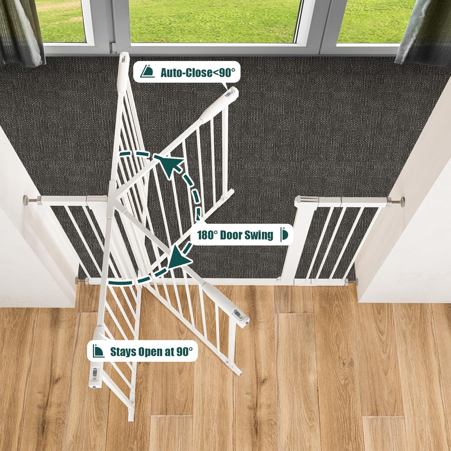 The pressure-mounted no drill baby gate can be automatically closed and locked when the door is open less than 90°, no need to worry about forgetting to lock the safety gate.