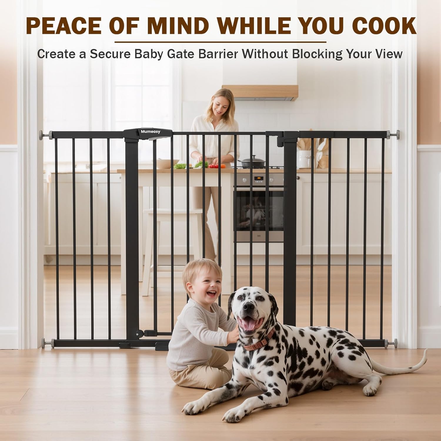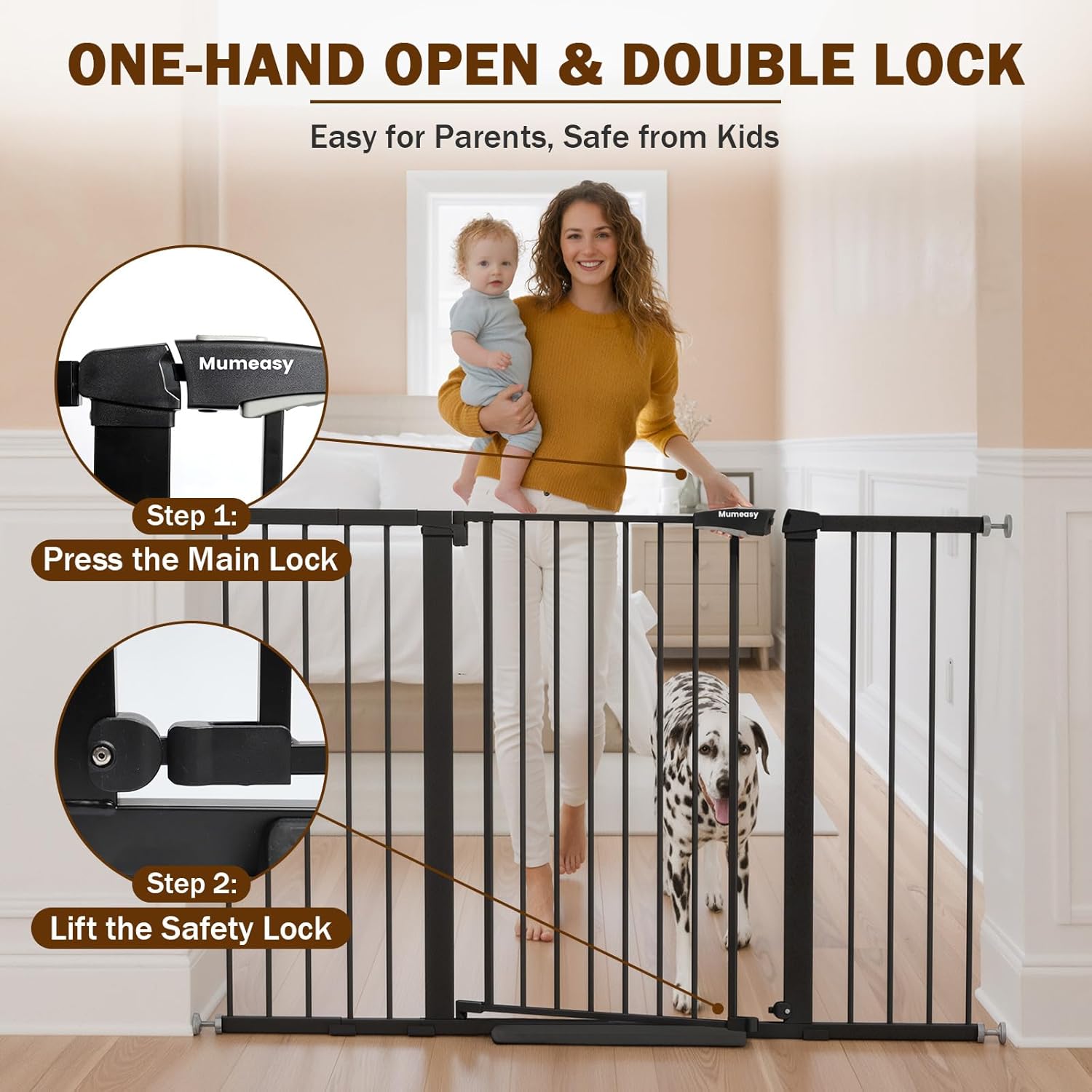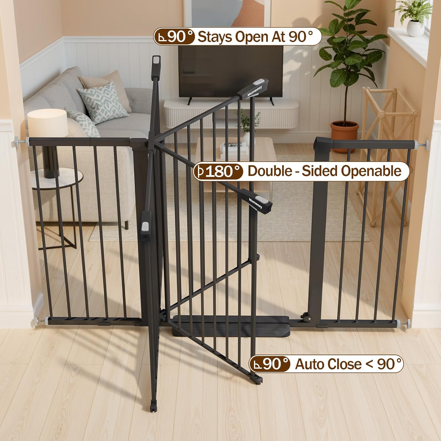 Mumeasy 29.7-57″ Extra Wide Baby Gate, Auto Close Large Dog Gate for Doorways, No Drilling Pressure Mounted Pet Safety Gate for Stairs, Easy Walk Through Child Gate for Hallways, House, Indoor, Black
