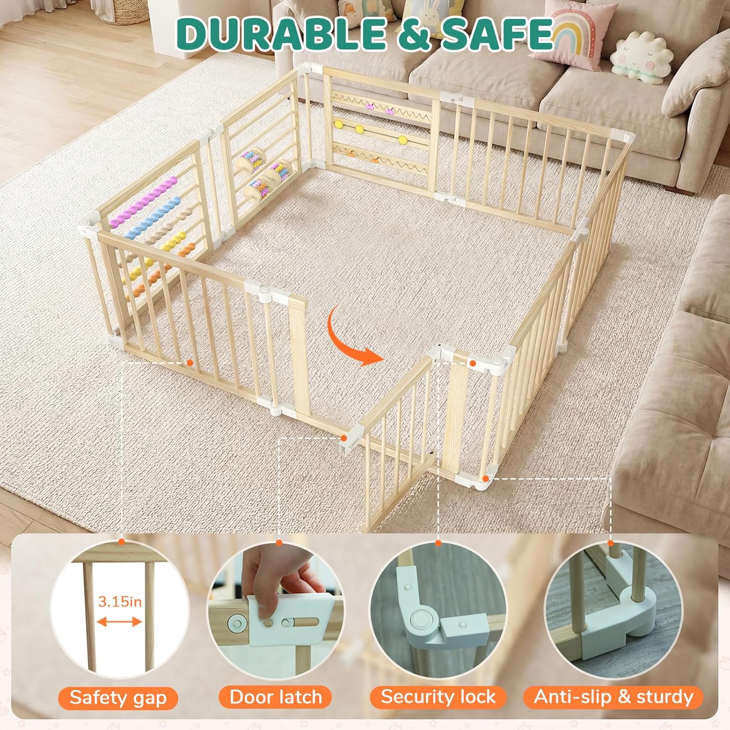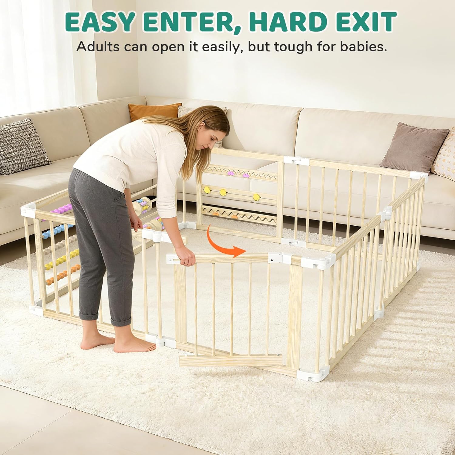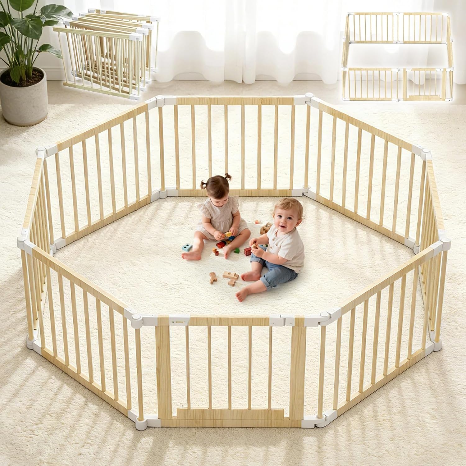OMZER 67×67 Inch Wooden Baby Playpen – Foldable Baby Gate Play Pen for Babies and Toddlers – Indoor & Outdoor Portable Play Fence Area Enclosure – Adjustable Extra Large Play Yard for Kids, 8 Panels
